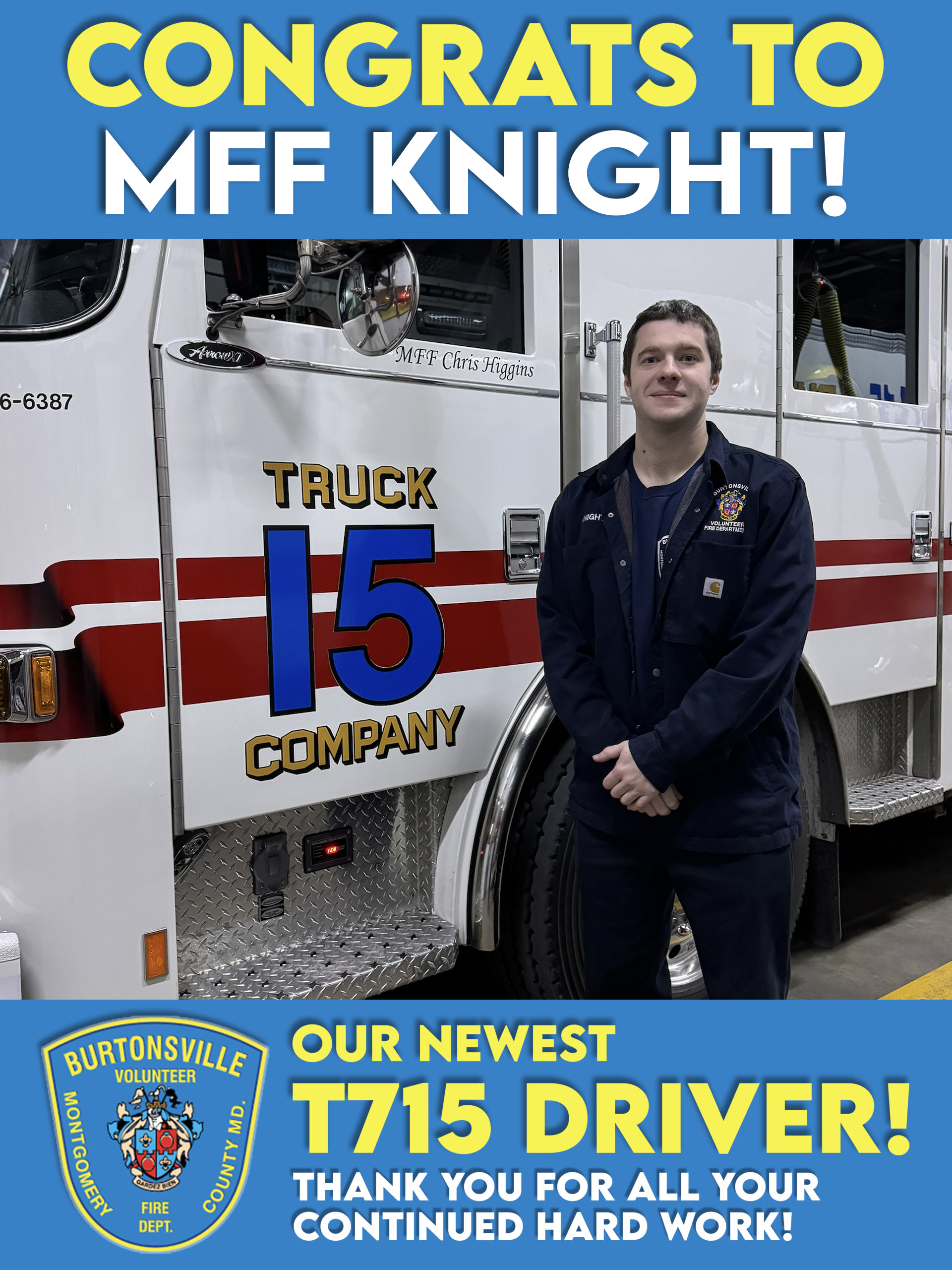 Please join Chief Ryman and the rest of the BVFD in congratulating MFF Andrew Knight, who has recently completed the requirements to be cleared to drive Truck 715.
